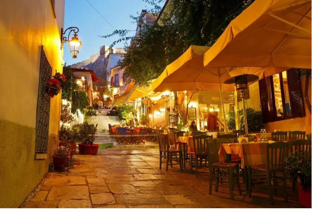 Es común ver las terrazas repletas de gente y turistas, así como danzas típicas y otras manifestaciones culturales. Todo esto con la hermosa visión de la Acrópolis iluminada.