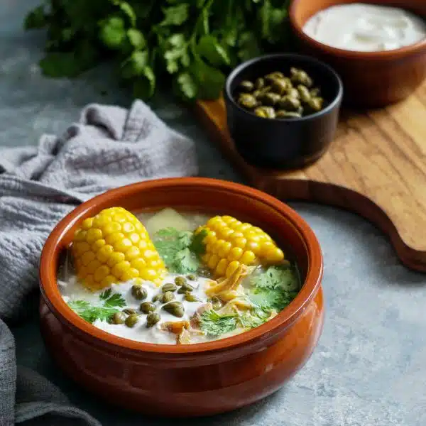 Si le preguntas a un colombiano cuál es la mejor sopa del mundo coma de la seguridad de qué te responderá con entusiasmo y sin dudar ¡Ajiaco! y es que no puedes pisar Colombia y no tomar al menos a un plato de Ajiaco Santafereño. es una sopa sustanciosa que representa la fusión entre américa y España, conviviendo en perfecta armonía alcaparras con el maíz y las hojas de guasca. Consiste en una sopa de pollo con maíz, espesada con 3 tipos de papas y aromatizada con guasca, una hierba típica de la región. Se sirve con alcaparras y crema de leche encima.