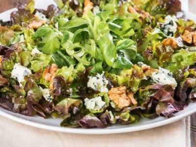 - En un tazón pequeño, combina las nueces, el queso azul, el aceite de oliva, el vinagre de vino tinto, la mostaza Dijon, el ajo, la sal y la pimienta.