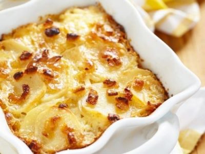 Coloca la mantequilla en un molde refractario y vierte encima la mezcla de papas y cremas. Espolvorea el queso por encima y gratina en el horno hasta que dore